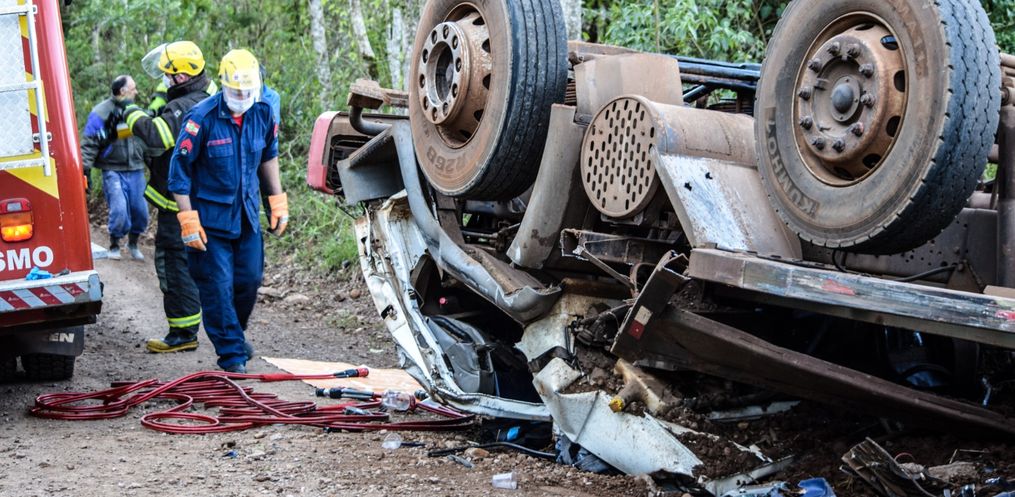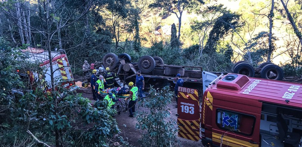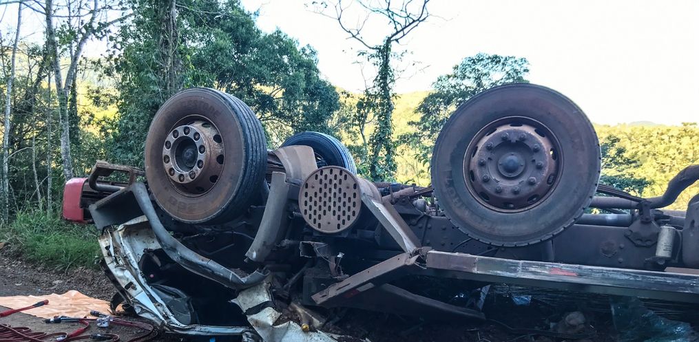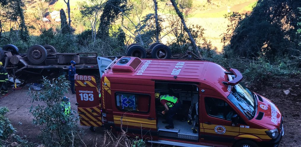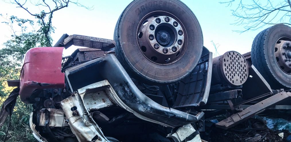 A máquina acabou despencando o barranco e o caminhão ficou tombado ao lado da estrada. Com o impacto, a cabine do caminhão ficou amassada.