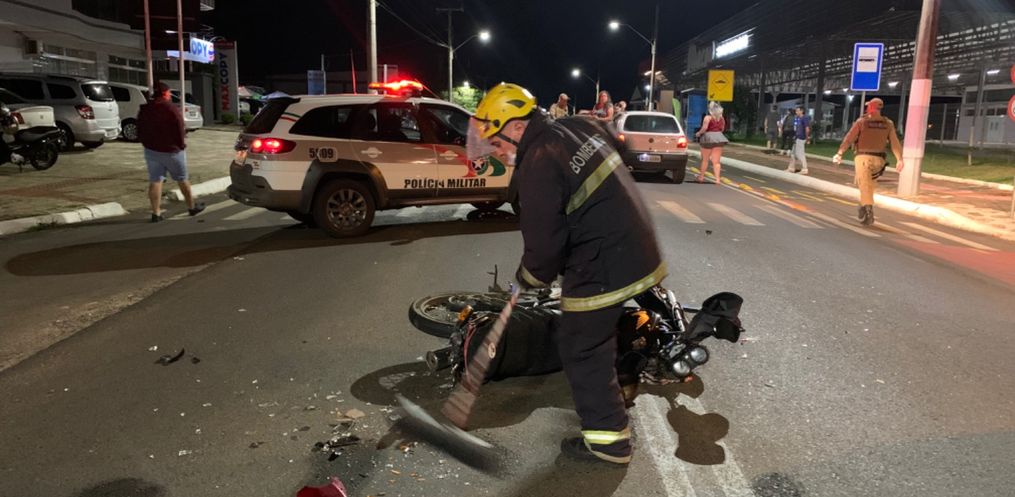 Uma motociclista sofreu suspeita de fratura em uma das pernas ao se envolver em um acidente na Rua Waldemar Rangrab, proximidades do Super Marcon em São Miguel do Oeste. O acidente aconteceu por volta das 22horas.