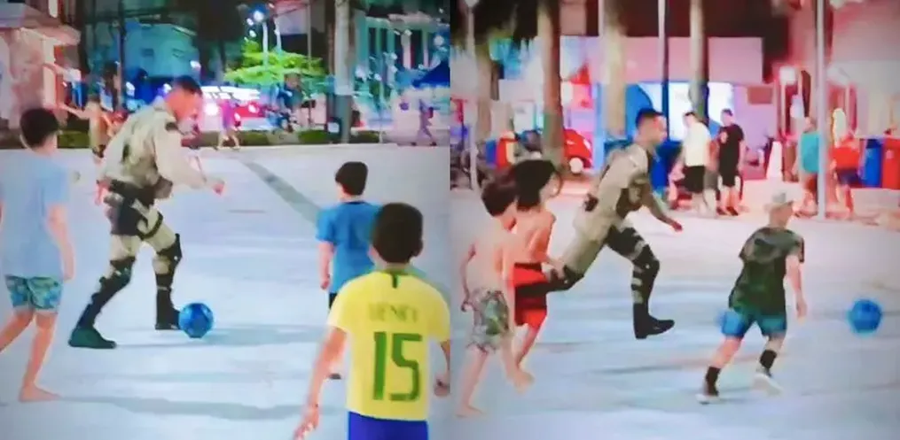 Um grupo de crianças que brincava em uma praça de Balneário Camboriú, no Litoral Norte catarinense, nesta quinta-feira (2) terminou o dia mais feliz. Isso porque eles puderam jogar uma partida de futebol com policiais militares que atuam no município.