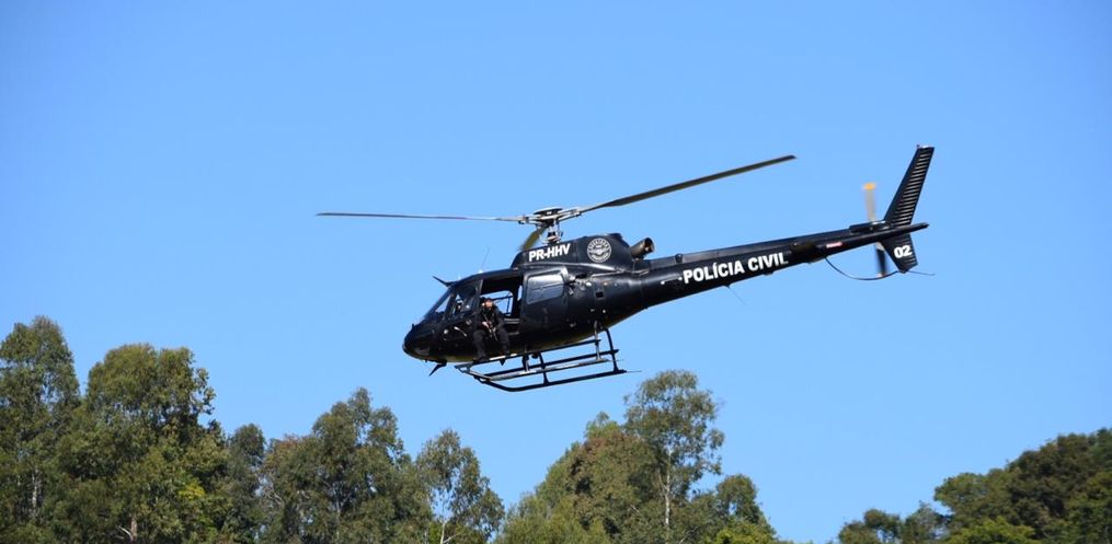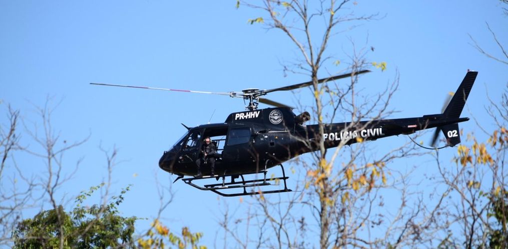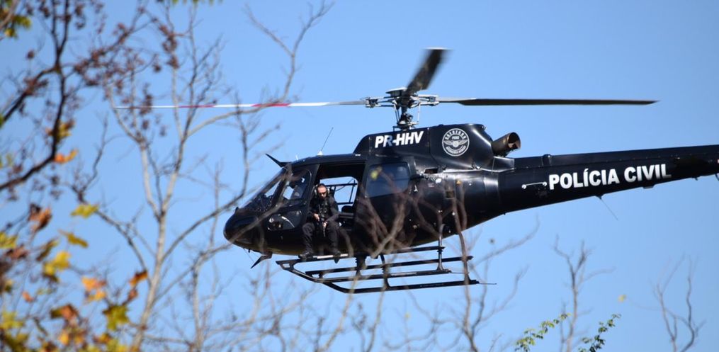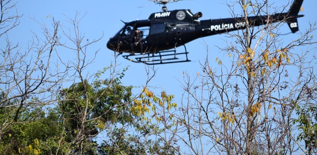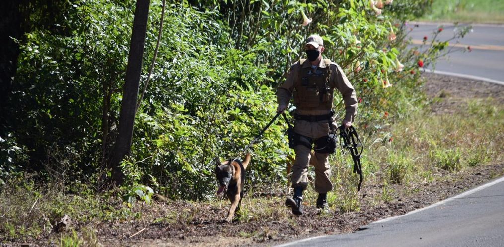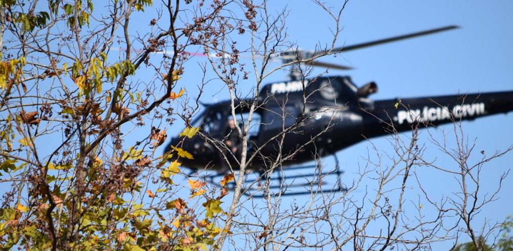 Apoiam a ação a Polícia Militar, helicóptero do Saer Fron e cães farejadores.